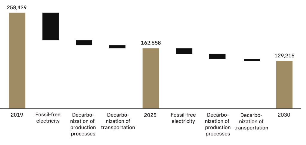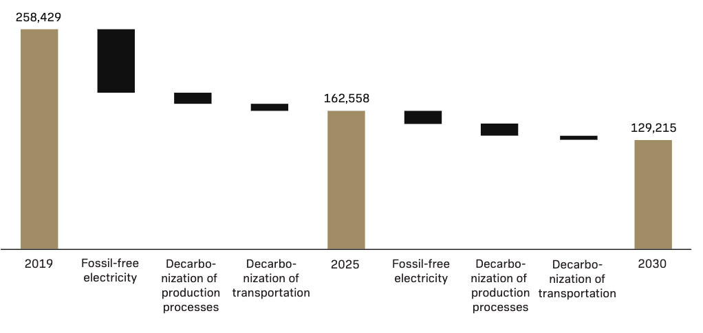 For own operations, we see efficiency measures and usage of fossil-free energy as key enablers for reducing GHG emissions. We approach our scope 1 and 2 emissions through the lens of transportation, production processes, and electricity usage. Our waterfall diagram on scope 1 and 2 reduction is based on these decarbonization levers.